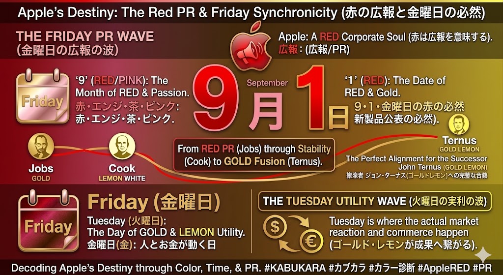 赤の数字「1」に加え、人とお金が動き出す実利の曜日「火曜日(レモン・ゴールド優先)」が重なる日。CEO交代のエネルギーが組織の隅々まで行き渡り、新時代のAppleが世界に「赤の衝撃」を与える、真のスタートラインとなります。広報(金曜日)で種をまき、実利(火曜日)で収穫する。このAppleのカラーリズムを知ることで、私たちは次の時代の波を読み解くことができます。