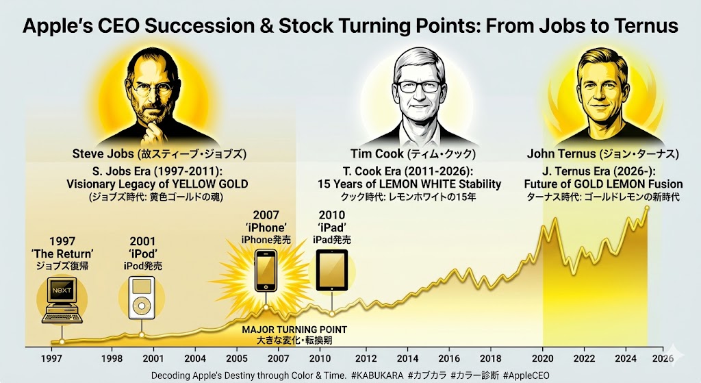 2026年、黄色レモンの時代。Appleに第一黄金期をもたらした故S.ジョブズ(黄色ゴールド)と、現代まで進化させ続けたT.クック(レモンホワイト)。この二人の色を融合させた「ゴールドレモン」の名を持つジョン・ターナスが、ついに新CEOへと就任します。