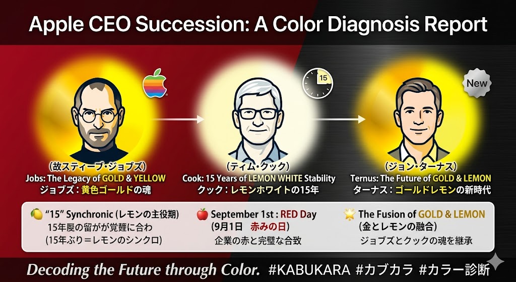 Appleは今、創業以来の「赤(情熱と伝統)」の血流を入れ替える歴史的転換点にあります。15年という「レモン(知性と効率)」のサイクルを完遂したティム・クック氏(レモンホワイト)が、2026年9月1日の「赤の日」に会長へ。後任のジョン・ターナス氏(ゴールドレモン)への交代は、洗練された「管理の時代」から、再び「ゴールド(価値創造)」を伴う攻撃的な拡大期への移行を意味します。